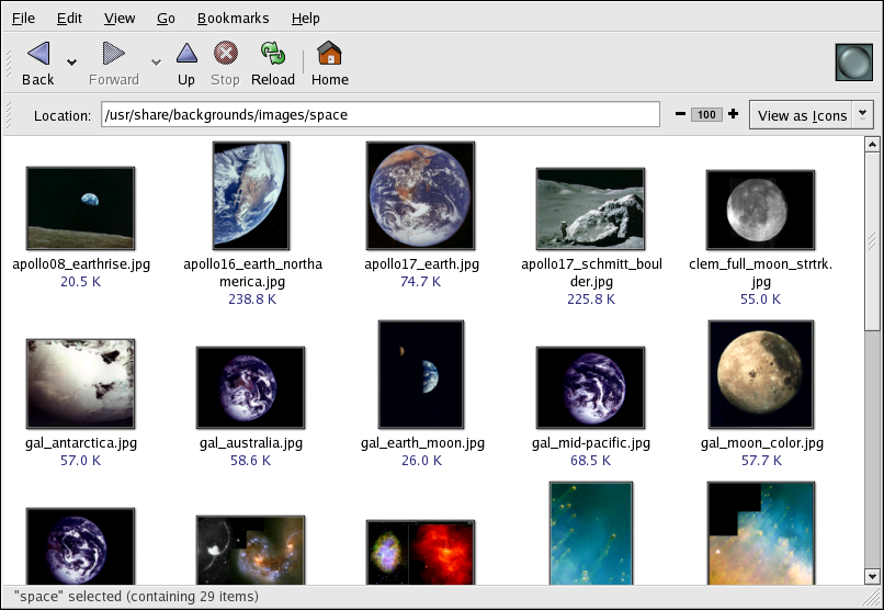 Nautilus is a general-purpose file manager and browser for the graphical desktop environment. Nautilus has many functions beyond simple image viewing; however, for this section, we only use it for basic image browsing. For more information about Nautilus, refer to Chapter 2 Using the Graphical Desktop.
