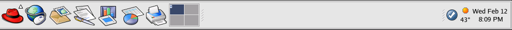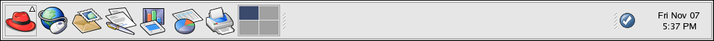 The desktop panel is the bar that stretches across the bottom of the screen and holds icons and small applications which makes using your system easier. The panel also holds the Main Menu, which contains shortcuts for all of your applications. Applets embedded on the panel allow you to run specific tasks or monitor your system or services while remaining out of your way. The notification area holds alert icons such as the one for Red Hat Network so that you can be quickly alerted to critical messages.
