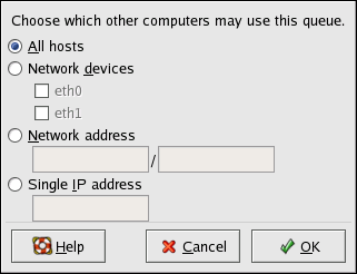 After selecting to share the queue, by default, all hosts are allowed to print to the shared printer. Allowing all systems on the network to print to the queue can be dangerous, especially if the system is directly connected to the Internet. It is recommended that this option be changed by selecting the All hosts entry and clicking the Edit button to display the window shown in Figure 34-18.